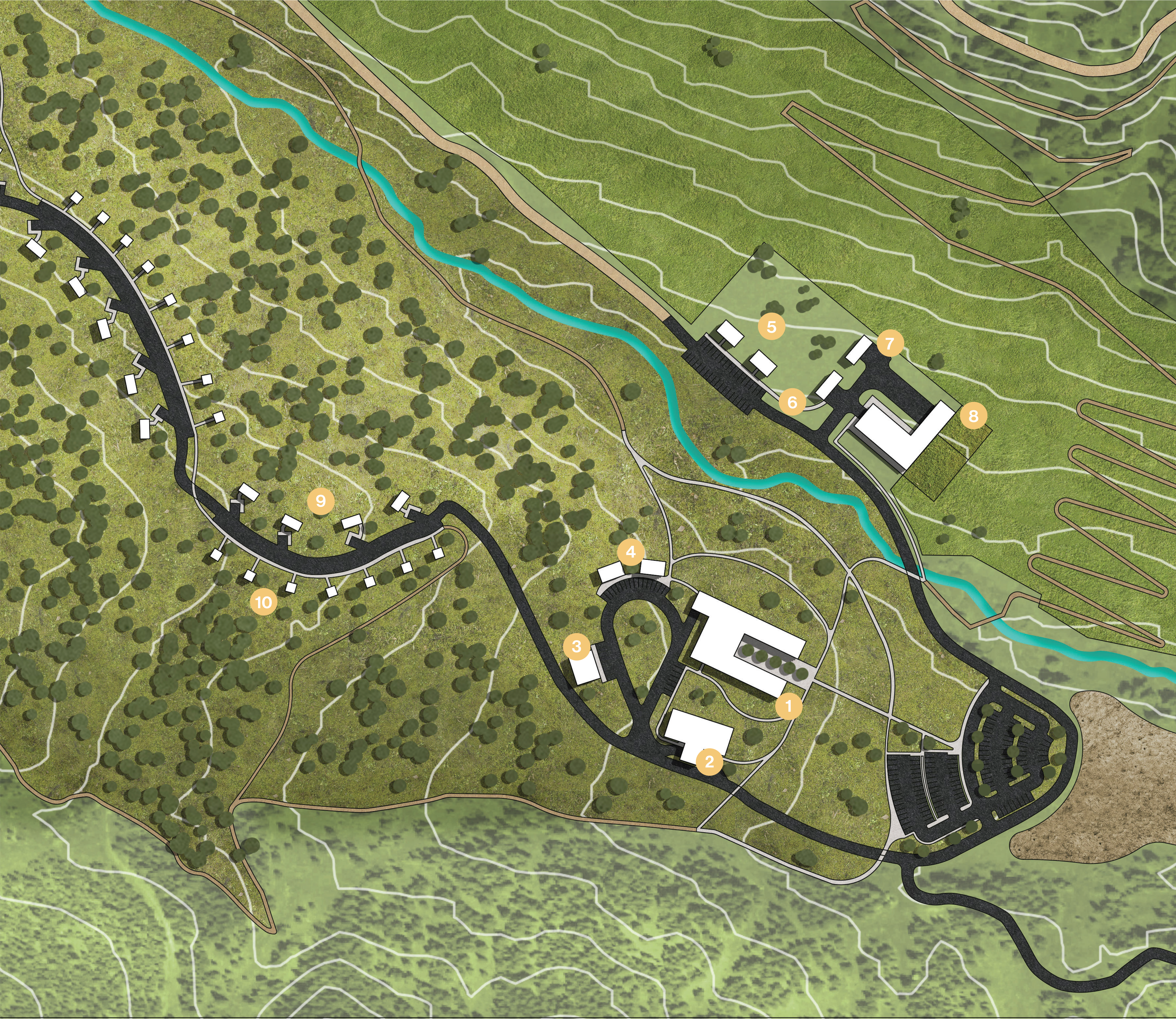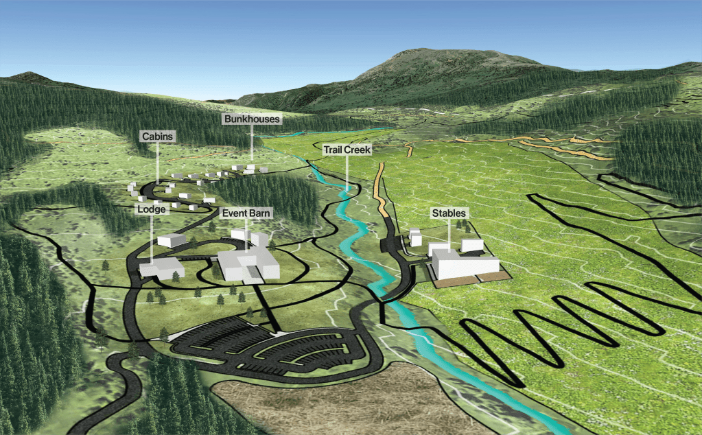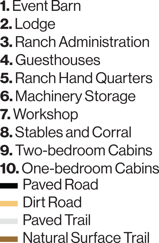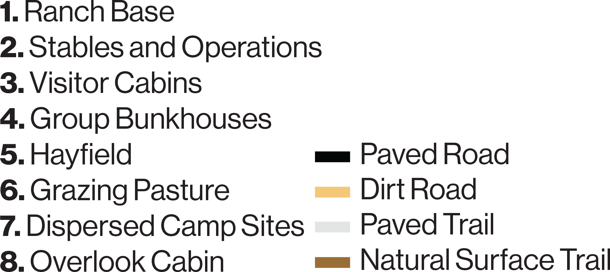 The ranch includes numerous cabins to accommodate visitors throughout the year with varying sizes and layouts. One and two-bedroom cabins are suited for families and small groups, while large bunkhouses supply accommodations for school groups, clubs, and other large organizations. The cabins are set on a scenic hillside with majestic views of the valley below. Two guesthouses lie behind the event barn to accommodate wedding parties and distinguished guests. Both the events barn and cabins have excellent access to Border Ridge Ranch’s extensive network of trails and backcountry roads. These routes supply access for hikers, off-road vehicles, and equestrians to locations across the property. Backcountry campsites exist throughout the site and provide space for undeveloped dispersed camping. Similarly, the Overlook Cabin is an remote, undeveloped cabin supplying even greater seclusion for adventurous visitors.