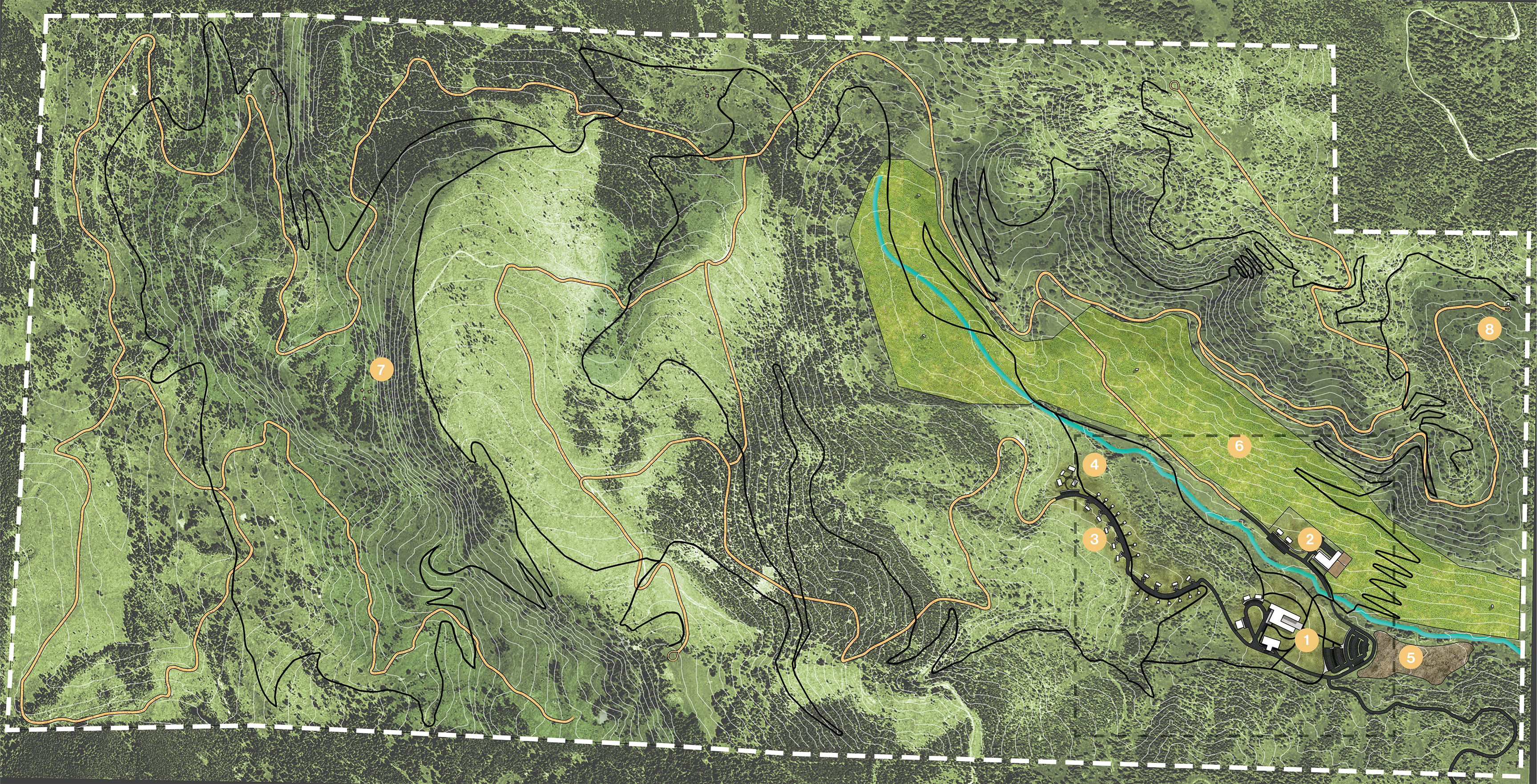 In addition to providing a scenic retreat for Bozeman-area residents, university staff, students, and visitors. Border Ridge is a fully functional cattle ranch. Th e property’s ranch amenities include a large stable with room for tack and feed, a machine shop, vehicle storage, corrals, a hayfield, loafing sheds, and ample grazing space. The ranch’s 1,300 acres hosts 400 head of cattle and 20 horses across its open range. The ranch’s year-round working status provides employment for area ranch hands, who assist with ranch operations and event facilitation. Visitors to the ranch can participate in educational experiences and trail rides, led by experienced ranch staff and educators. Visitors can participate in multi-day pack trips on the ranch’s 16 miles of scenic trails. Scenic landscapes such as wetlands, steep cliffs, gulleys, and high mountain meadows lie along the winding trails.